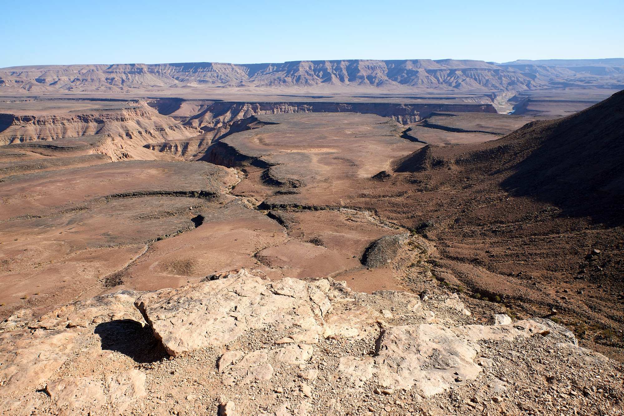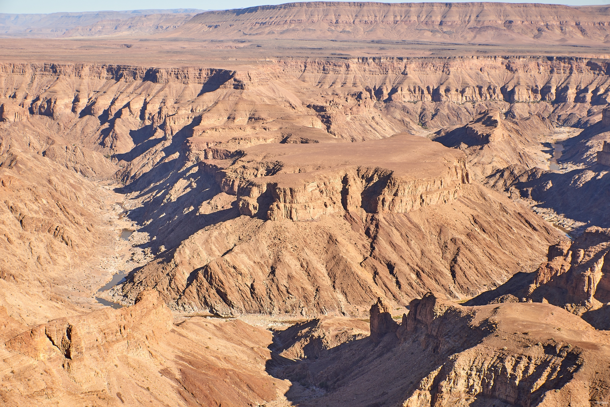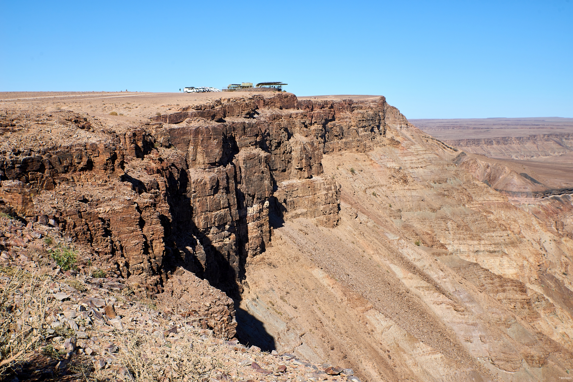 Da wir in Ai-Ais zwei Übernachtungen gebucht hatten, holten wir heute den Ausflug zum Fish River Canyon, dem zweitgrößten Canyon der Welt nach. Die Wolken vom Vortag hatten sich mittlerweile verzogen und uns erwartete schönstes Wetter mit strahlenblauem Himmel.