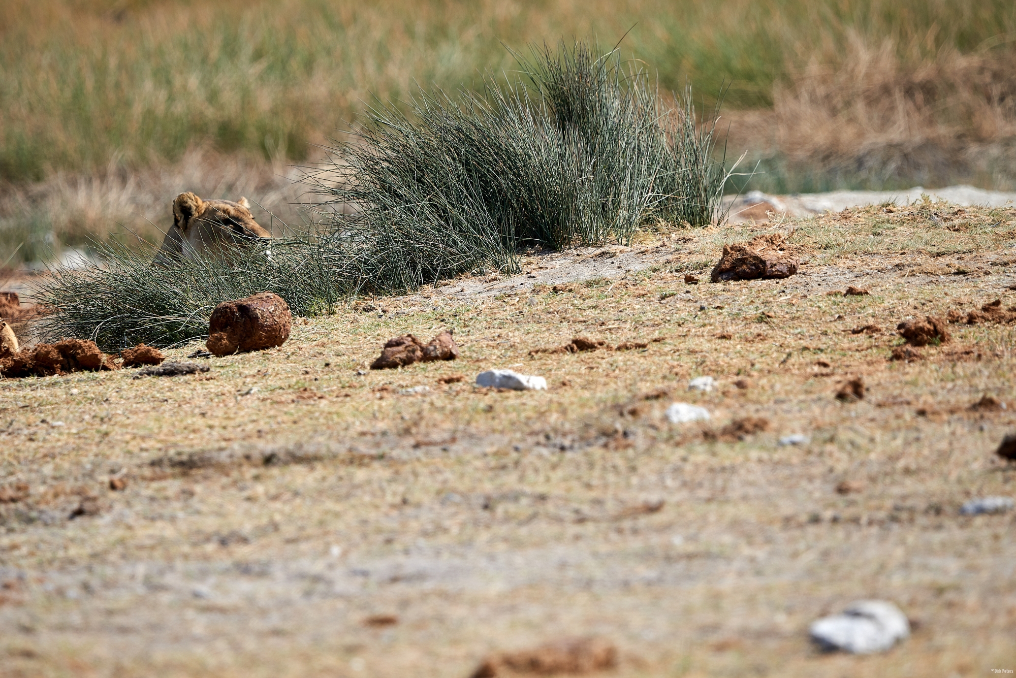 Bisher war es uns nicht vergönnt, auch nur ein Raubtier zu sehen, obwohl alle Reiseführer der Meinung sind, man muss nur aus dem Fenster schauen. Erst am Wasserloch Okerfontain sahen wir eine Löwin, die sich an der Böschung des Wasserlochs im Gras versteckte.