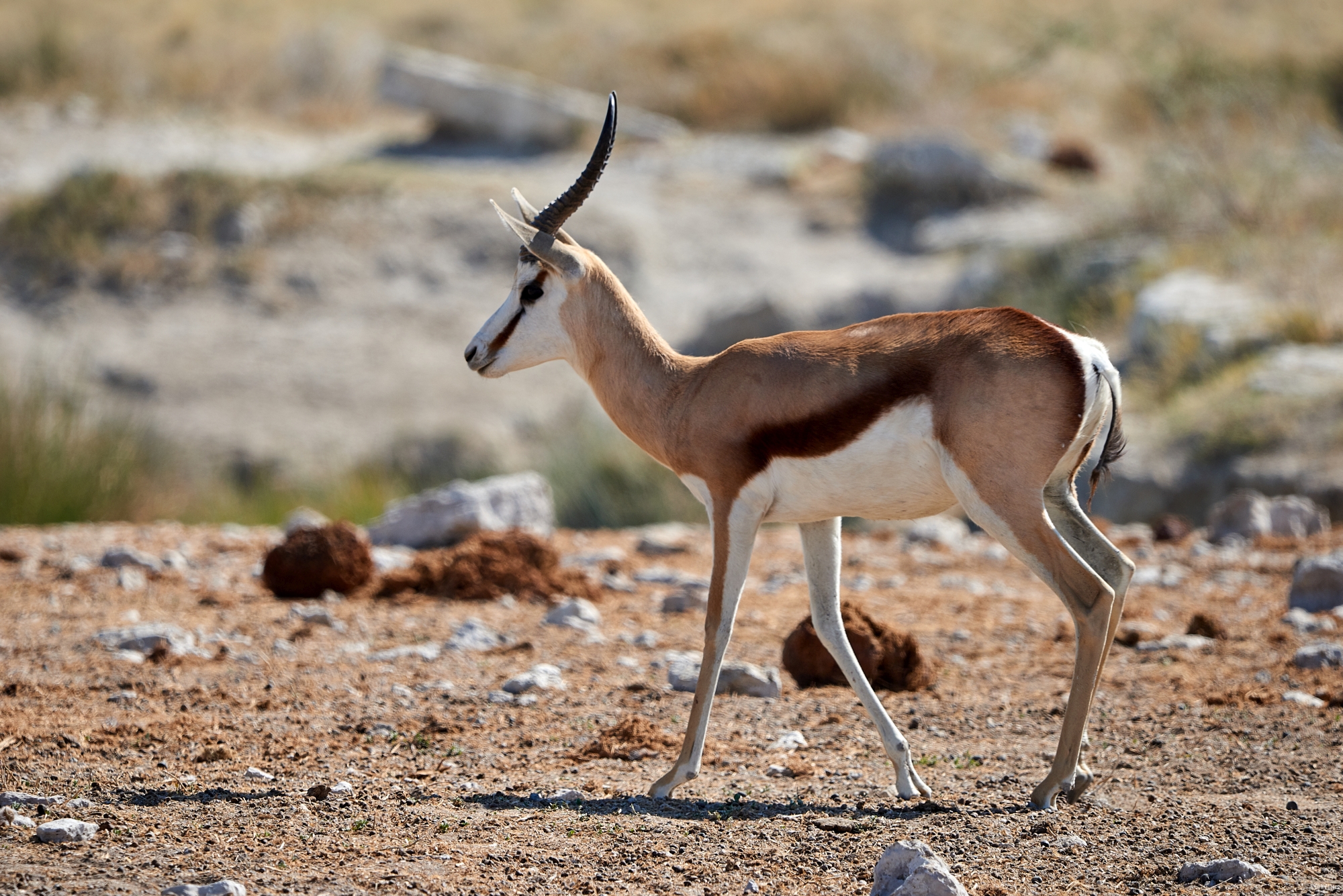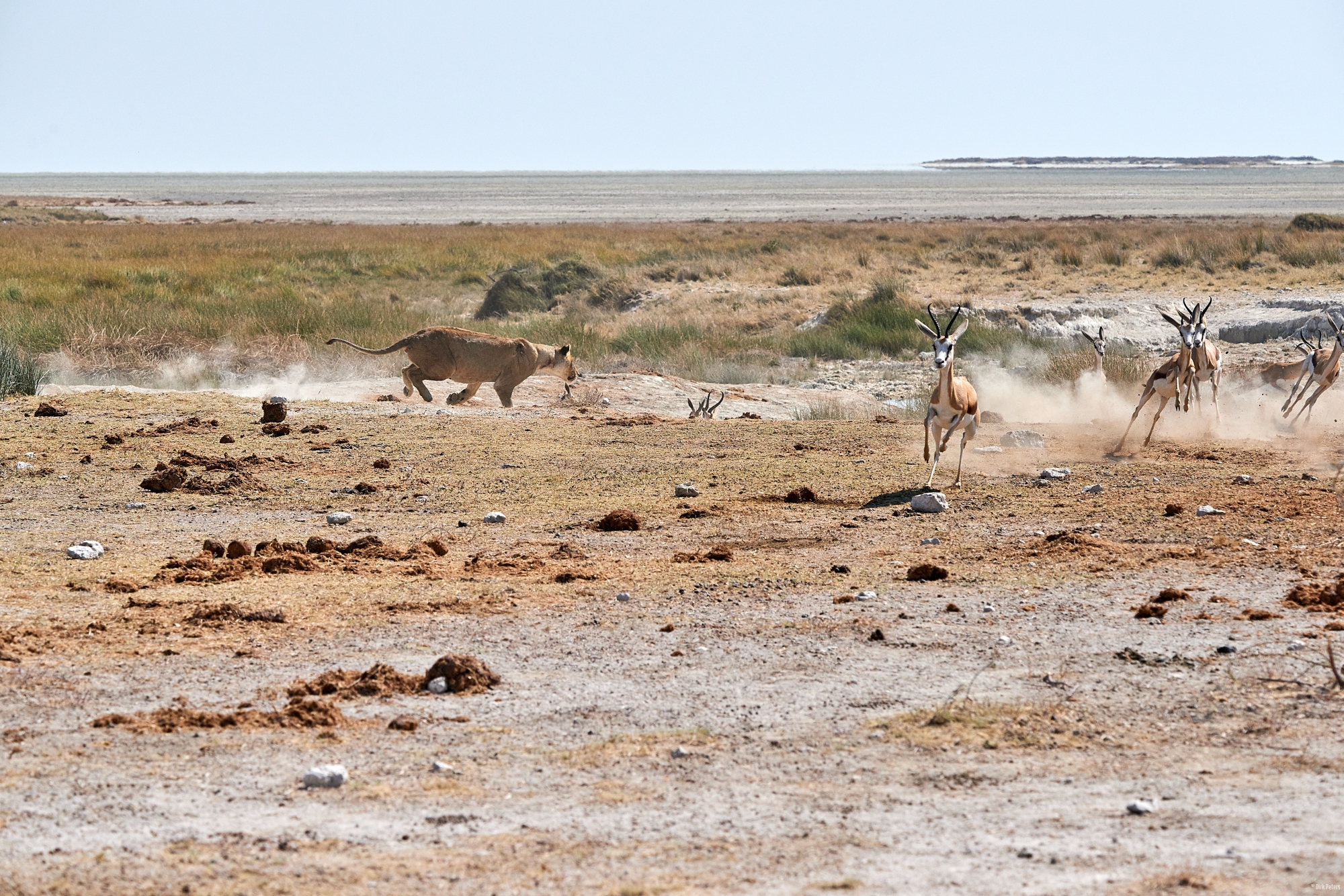 Vermutlich hat die Löwin einigen Springböcken den Weg vom Wasserloch abgeschnitten und verschwand hinter der Böschung. Wir haben sie auf jeden Fall nicht mehr zu Gesicht bekommen.