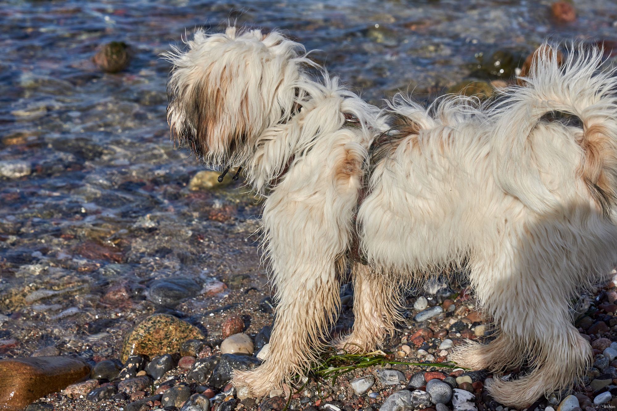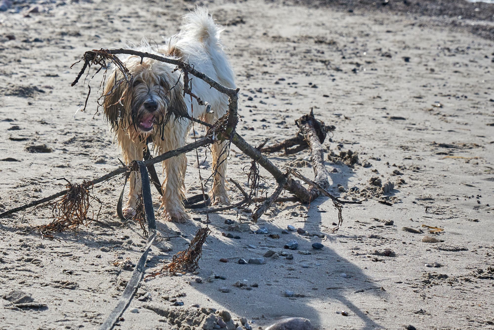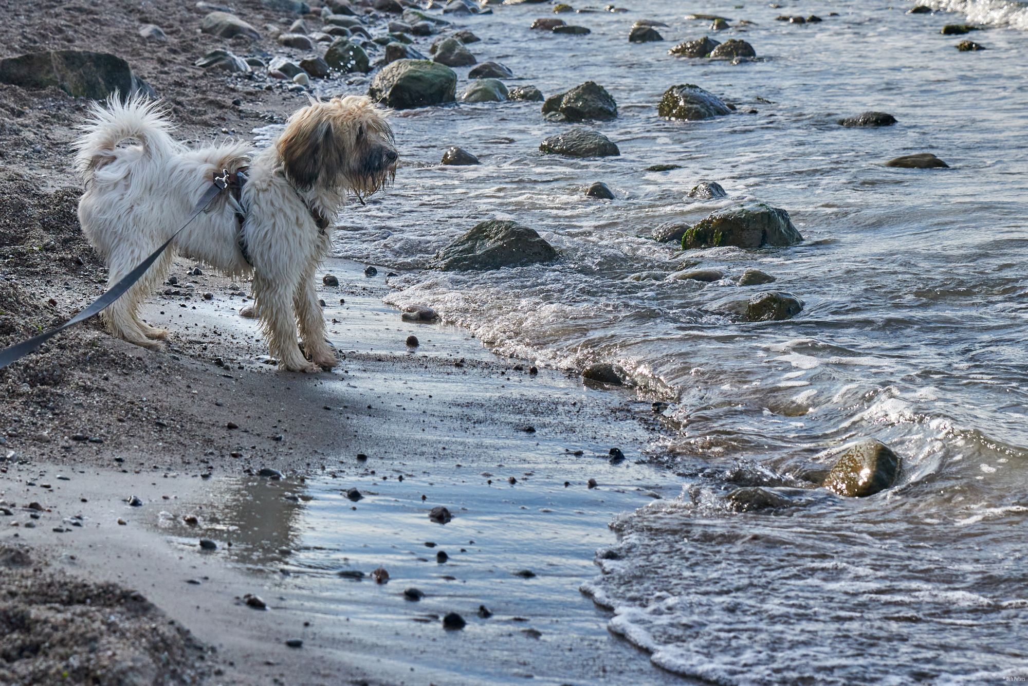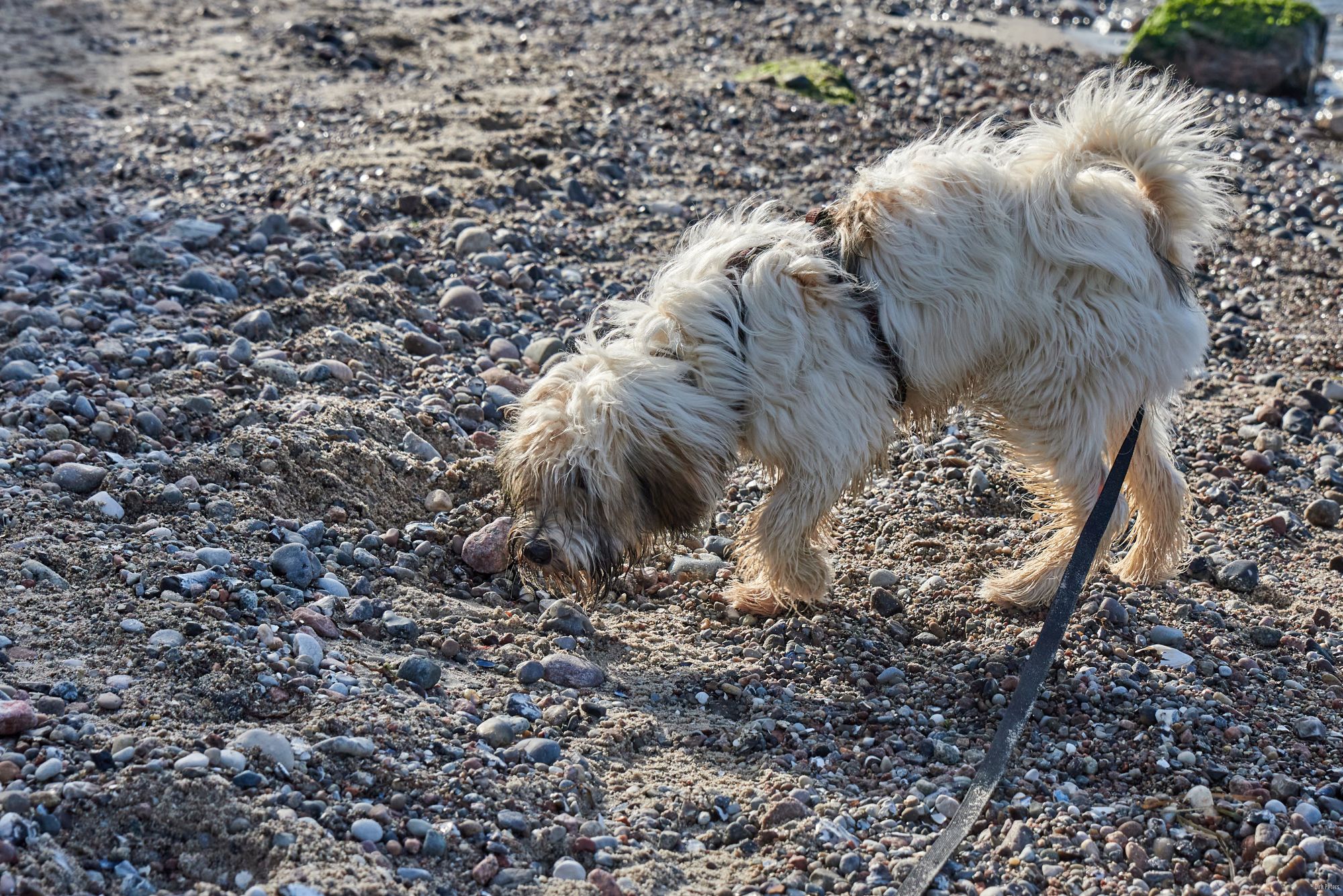 Strand ist einer von Filou’s Lieblingsorte. Wasser, Sand, sowie große und kleine Steine.