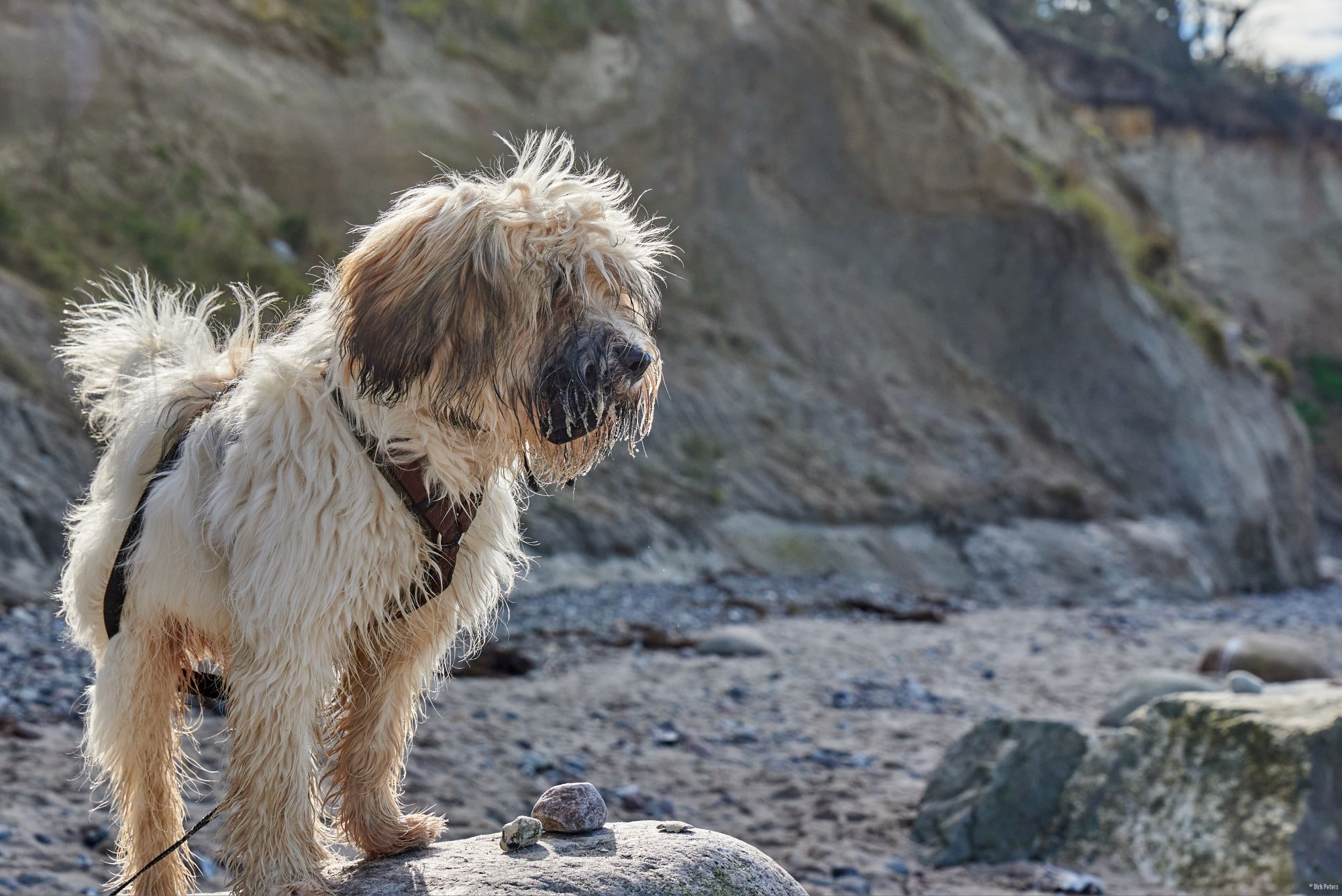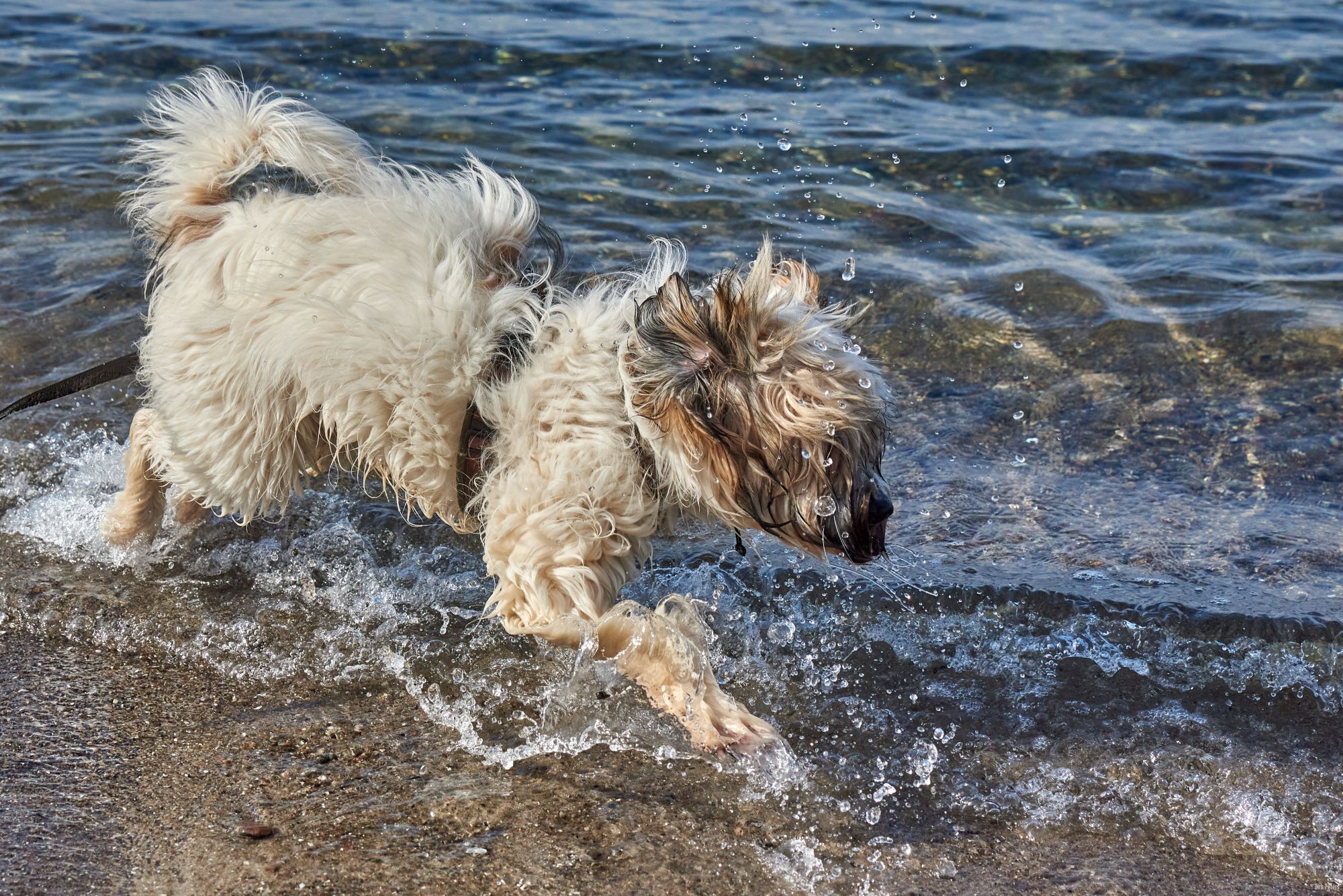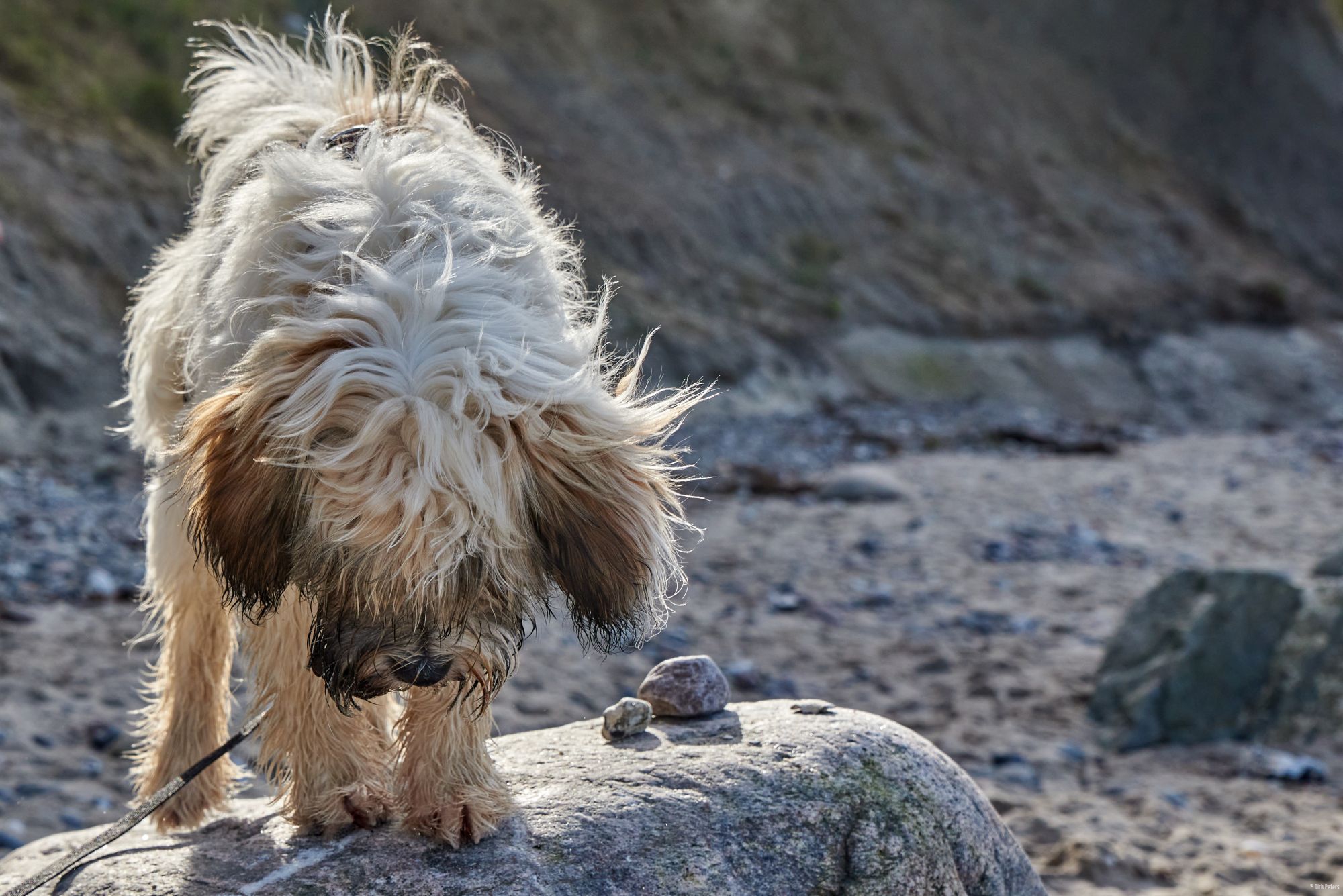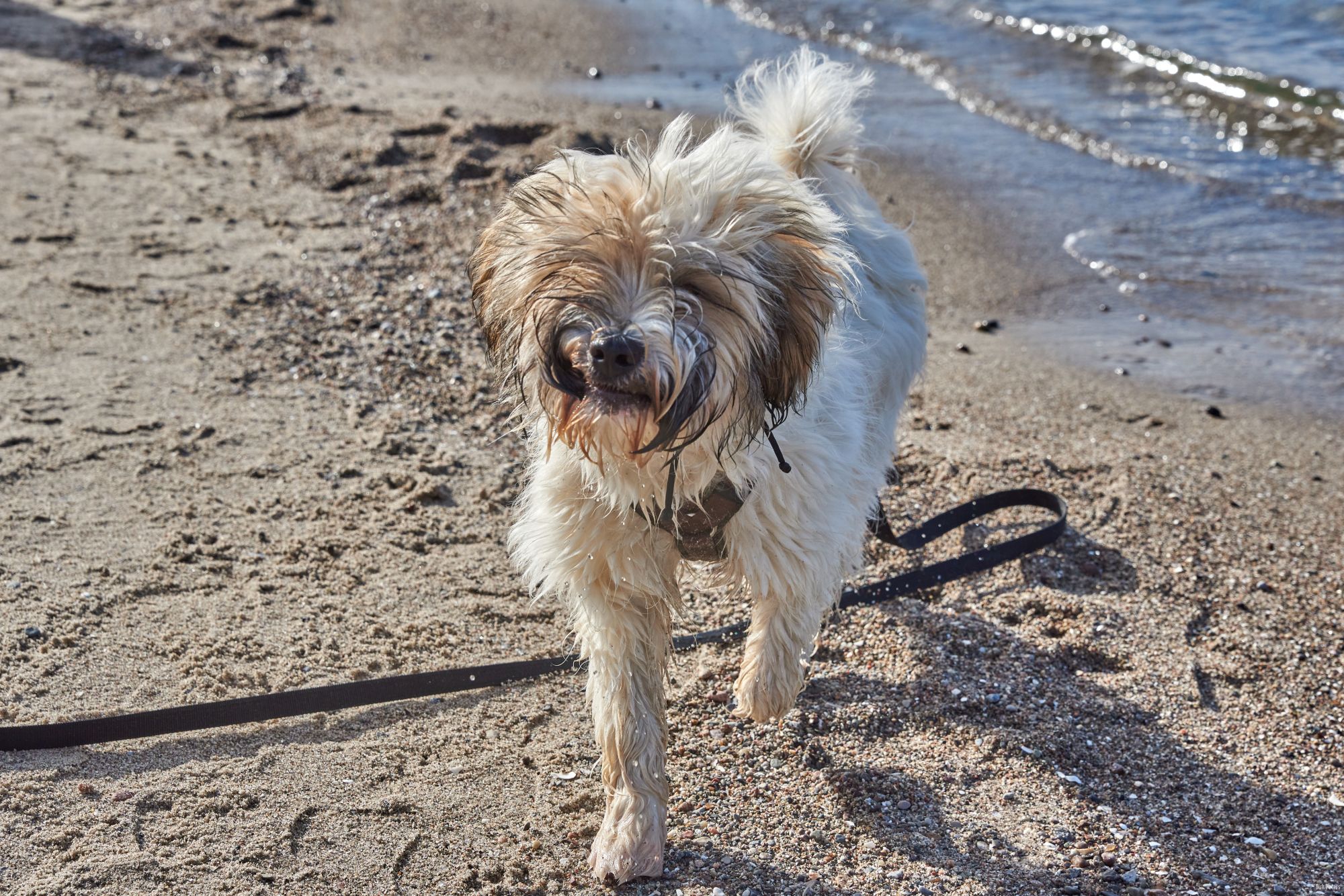 Strand ist einer von Filou’s Lieblingsorte. Wasser, Sand, sowie große und kleine Steine.